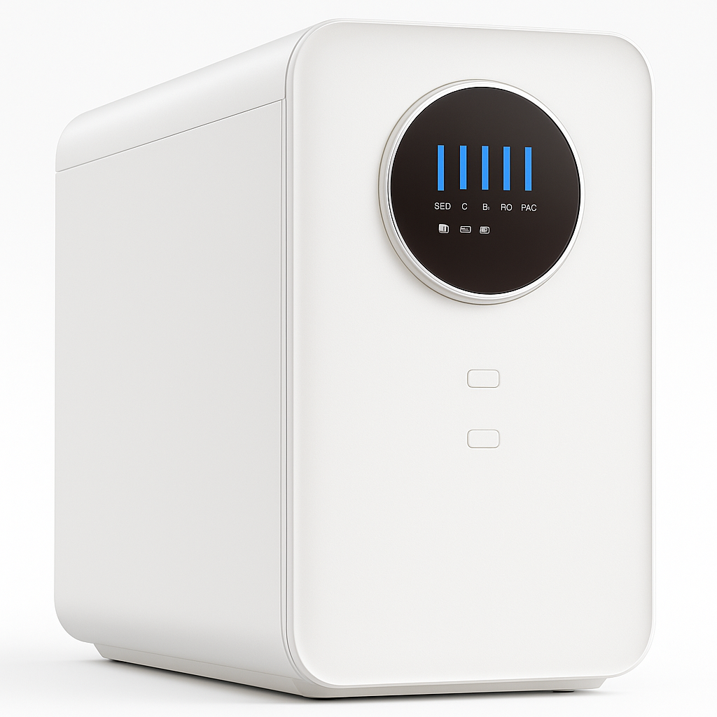 Egy kompakt, nagy teljesítményű víztisztító berendezés, amely a fordított ozmózis elven múködik.